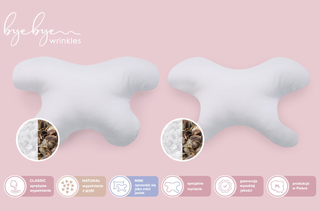 Poduszki Bye Bye Wrinkles wybieramy według potrzeb oraz indywidualnych preferencji. Jeśli lubimy spać na poduszce, która jest bardziej miękka – dobrym wyborem będzie wersja CLASSIC (wypełnienie z włókien poliestrowych). Możemy wybrać spośród różnych rodzajów poszewek: jedwabna (wzmaga efekt przeciwzmarszczkowy), bawełniana, z włókien bambusa, z dodatkiem alg. Jeśli lubimy spać na twardszej poduszce, warto zainteresować się wersją NATURAL, która posiada wypełnienie z łusek gryki. Możemy wybrać spośród poszewek z jedwabiu, z włókiem bambusa oraz z dodatkiem alg. Wersja MINI sprawdzi się jako “mini jasiek”. Jest to propozycja dla osób, które nie chcą rozstawać się z dotychczasową poduszką. Poduszka posiada wypełnienie z silikonowanych kulek poliestrowych oraz z łusek z gryki. Dostępna jest z poszewką z jedwabiu, bawełny oraz bambusowa z dodatkiem alg.