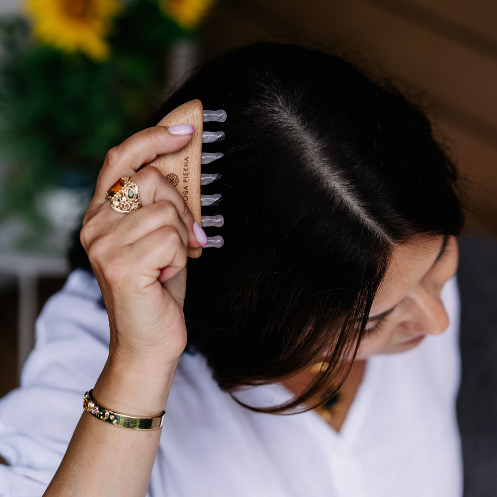 Masaż drewnianym grzebieniem z kwarcem zawsze wykonujemy po oczyszczeniu skóry głowy, czyli umyciu włosów. Grzebień kwarcowy przykładamy do skóry i delikatnie czeszemy włosy, wykonując subtelne, koliste ruchy.