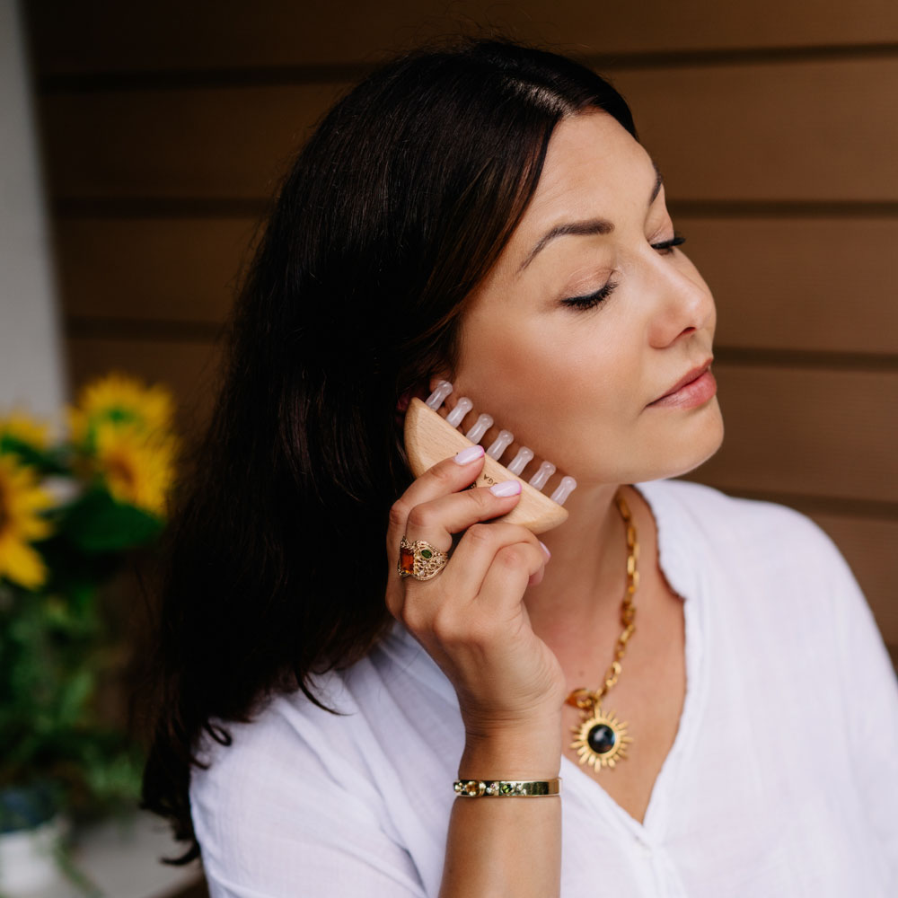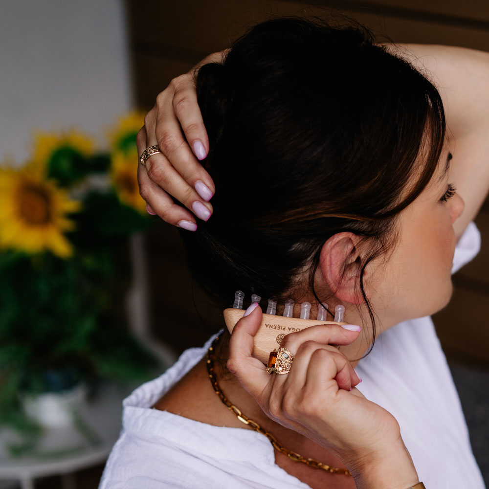 Wzmocnij cebulki swoich włosów, pobudź je do wzrostu, zrelaksuj skórę głowy, karku, ale też żwaczy oraz mięśni skroniowych, które odpowiadają za wygląd twarzy. Drewniany grzebień z kwarcem do masażu i relaksacji napiętych mięśni to akcesorium, które pokochasz, szczególnie jeśli spędzasz wiele godzin przy biurku.