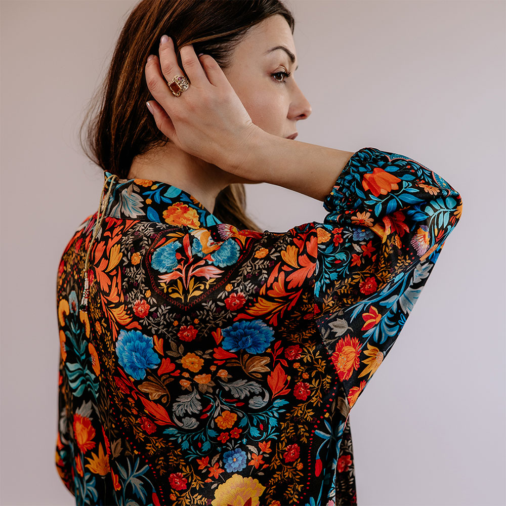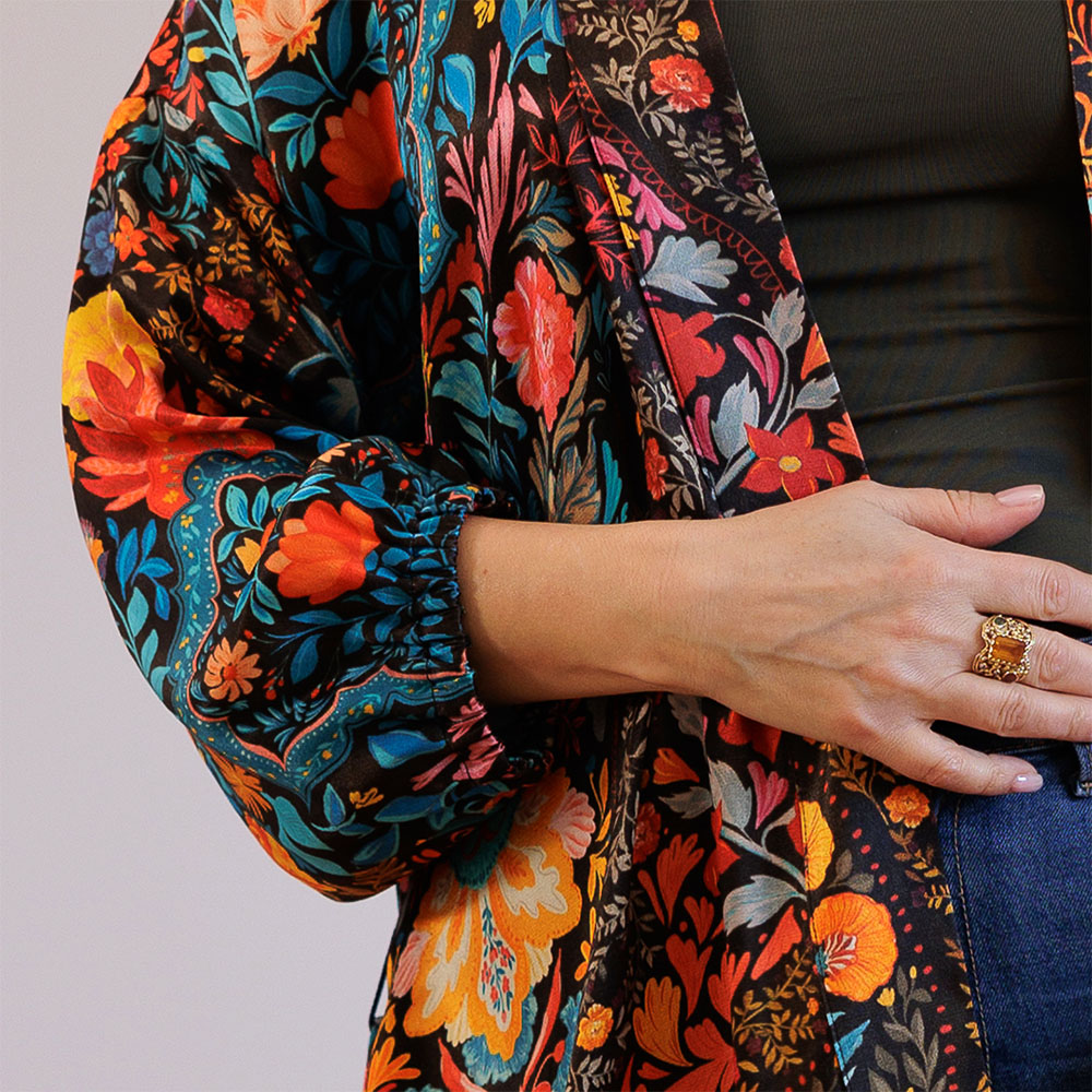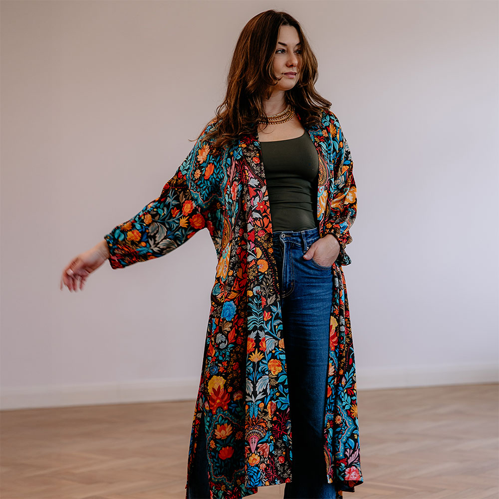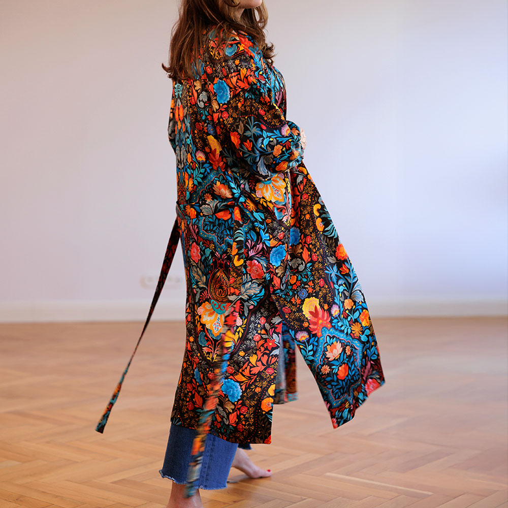Kimono SHANTI zachwyca bogactwem barw i wzorów, które harmonijnie splatają się w artystyczną całość..