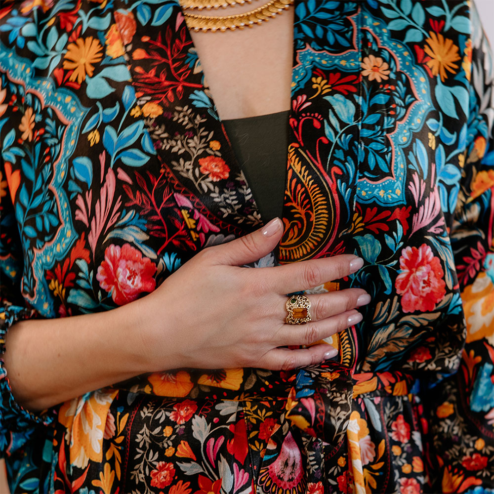 Kimono SHANTI szyjemy z najwyższej jakości wiskozy – tkaniny, która łączy w sobie elegancję i komfort noszenia. Materiał jest mięsisty, otula sylwetkę i pięknie się układa, nie tracąc przy tym swojej naturalnej miękkości.