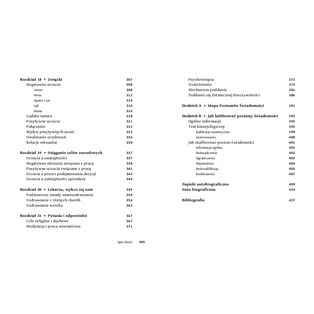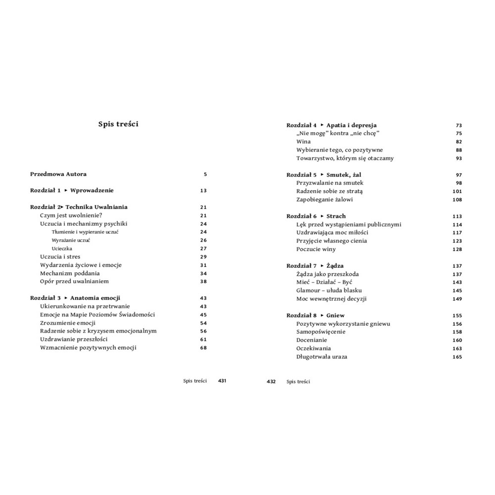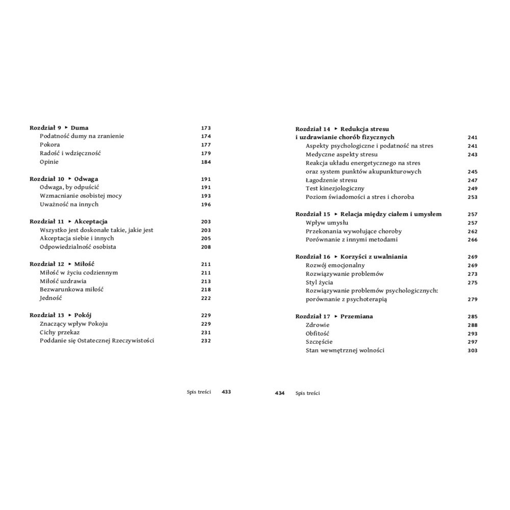 Dr. David Hawkins, amerykański psychiatra, który odniósł imponujące sukcesy terapeutyczne wyjaśnia w książce dlaczego tak modne obecnie wyrażanie uczuć, wcale nie pomaga sobie z nimi radzić i proponuje zupełnie nowe podejście do tematu, które stosował zarówno w pracy z pacjentami jak i we własnym życiu. Autor krok po kroku opisuje Technikę Uwalniania – prostą i skuteczną metodę, która pozwala uwolnić się od negatywnych emocji i stanów umysłu, by w pełni cieszyć się miłością, powodzeniem, zdrowiem i szczęściem. Zawiera praktyczne wskazówki jak poradzić sobie samodzielnie z apatią, smutkiem, żalem, strachem, żądzą czy gniewem, pokazuje anatomię emocji w uzdrawianiu przeszłości, uczy poddawania negatywnych myśli oraz budowania pozytywnych uczuć. Powinien przeczytać ją każdy, kto poważnie traktuje własny rozwój.