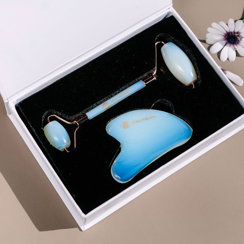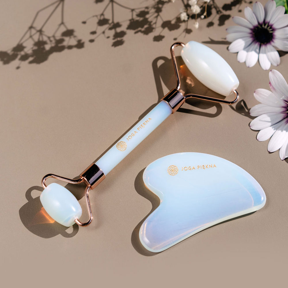 Biały zestaw masażerów: roller i Gua Sha z opalitu pomoże Ci zachować młody wygląd skóry. Jest to mineraloid ceniony za właściwości wygładzające i przeciwzmarszczkowe. Pobudza krążenie limfy, pomaga w odchudzaniu, jest pomocny w kaszlu i chorobach układu oddechowego. Wspiera, relaksuje i uspokaja. To najlepszy wybór dla osób, które szukają masażerów wspierających głęboką pracę wewnętrzną.